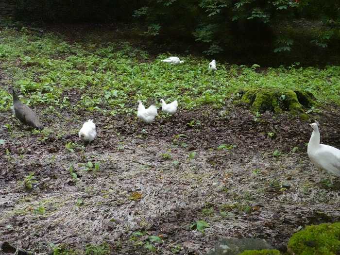 白い体で 尾が長い鳥(写真右)は 白色インドクジャク(White Indian Peafowl)。
