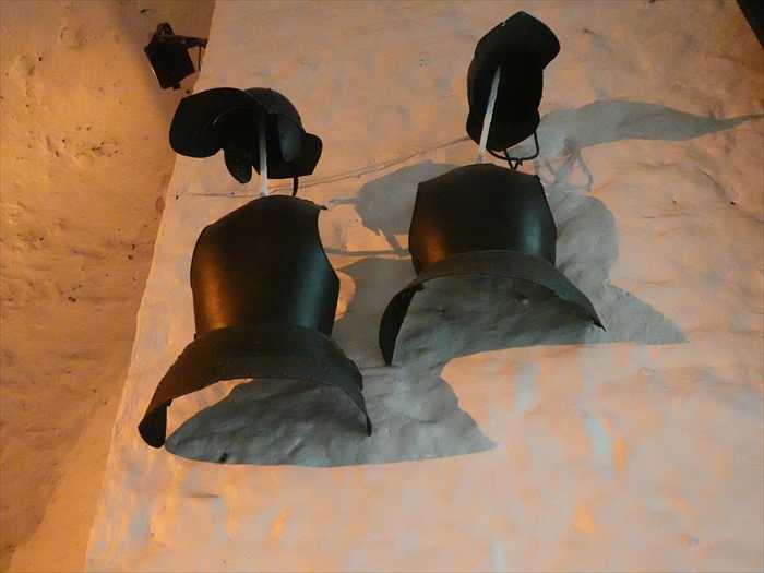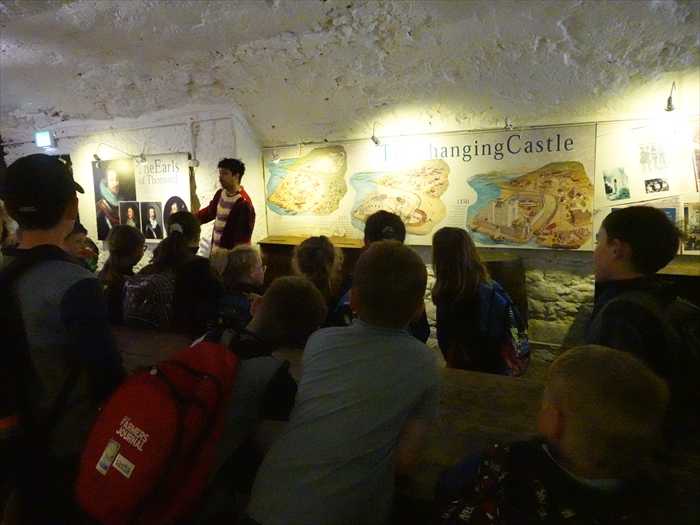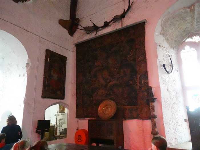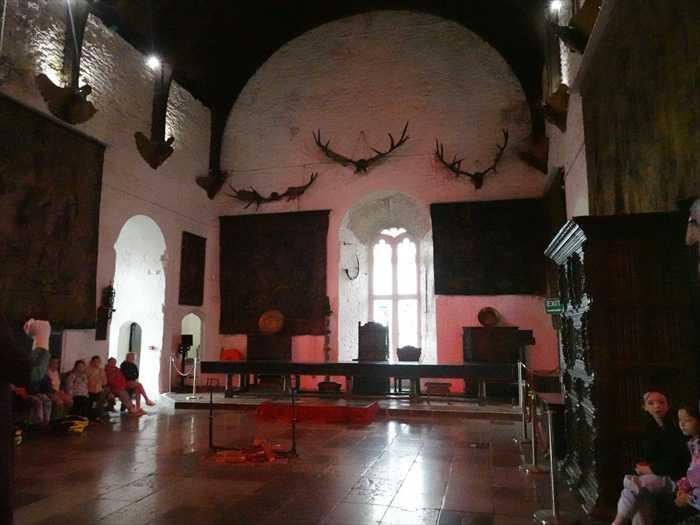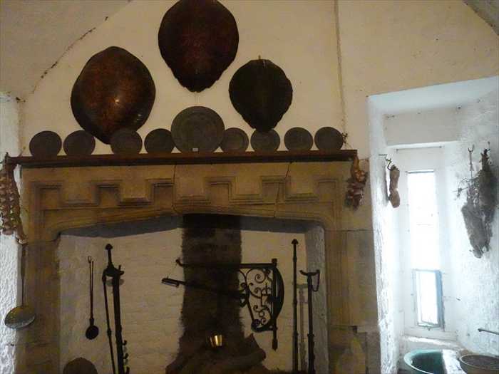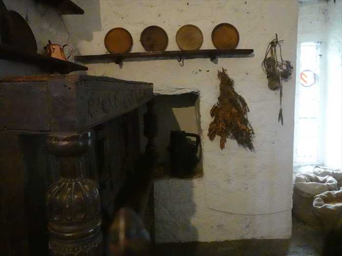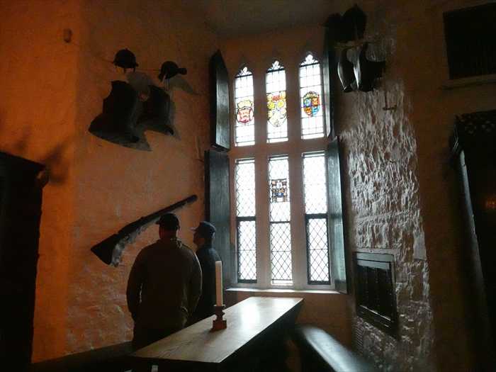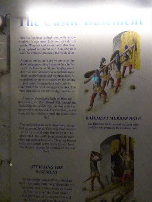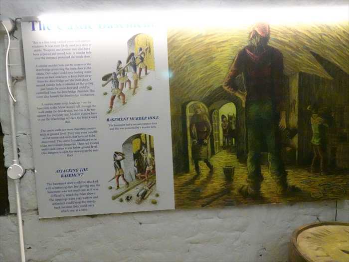 「The Castle Basement This is a fine long vaulted room with narrow windows. It was most likely used as a store or stable. Weapons and armour may also have been repaired and stored here. A murder hole over the entrance protected the inside door. A similar murder hole can be seen over the drawbridge protecting the main door to the castle. Defenders could pour boiling water down on their attackers to keep them away from the drawbridge and the main door. A second murder hole is situated on the ceiling just inside the main door and could be controlled from the drawbridge chamber. This room also houses the drawbridge mechanism.