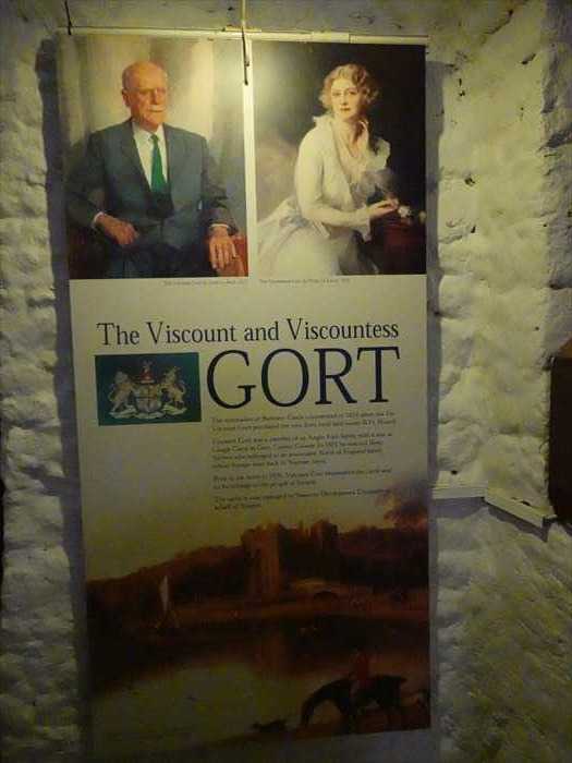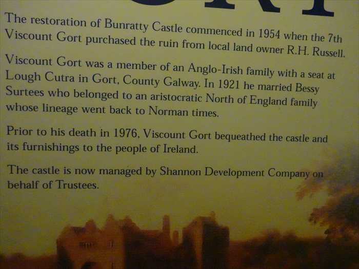 「The restoration of Bunratty Castle commenced in 1954 when the 7th Viscount Gort purchased the ruin from local land owner R.H. Russell. Viscount Gort was a member of an Anglo-Irish family with a seat at Lough Cutra in Gort, County Galway. In 1921 he married Bessy Surtees who belonged to an aristocratic North of England family whose lineage went back to Norman times. Prior to his death in 1976, Viscount Gort bequeathed the castle and its furnishings to the people of Ireland. The castle is now managed by Shannon Development Company on behalf of Trustees.」
