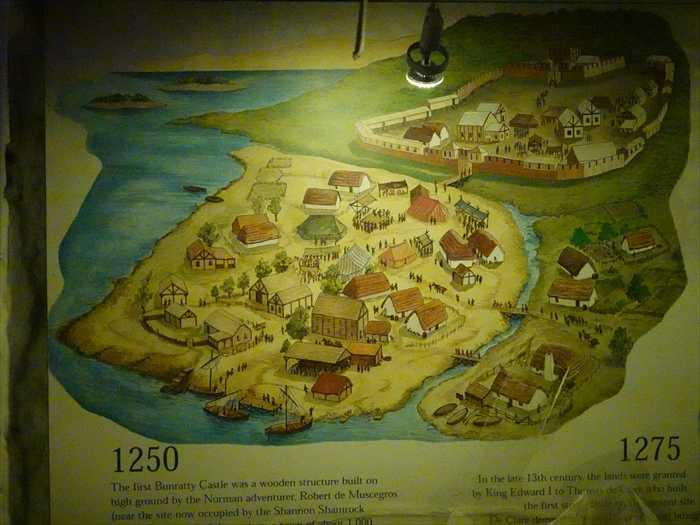 「The first Bunratty Castle was a wooden structure built on high ground by the Norman adventurer Robert de Muscegros (near the site now occupied by the Shannon Shamrock).」 【1250年 最初のバンラッティ城は、ノルマン系の冒険者ロバート・デ・ミューセグロスによって高台に築かれた木造の要塞でした(現在のシャノン・シャムロックのある場所に近い地点】 「In the late 13th century the lands were granted by King Edward I to Thomas de Clare who built the first stone fortress.」 【1275年 13世紀後半、エドワード1世がこの土地をトマス・デ・クレアに与え、彼が最初の石造の要塞 (石の城)を築きました。】
