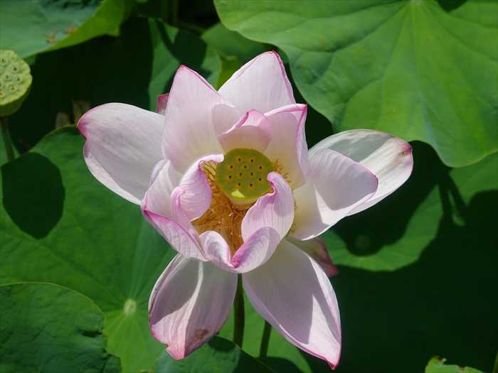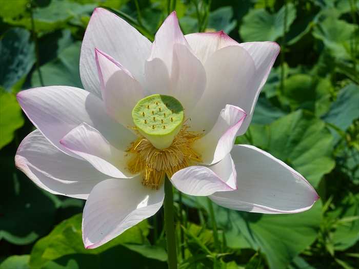 蓮の花は、 中央の平らな部分が花托(かたく) で、その上に雌しべが並んでいます。
