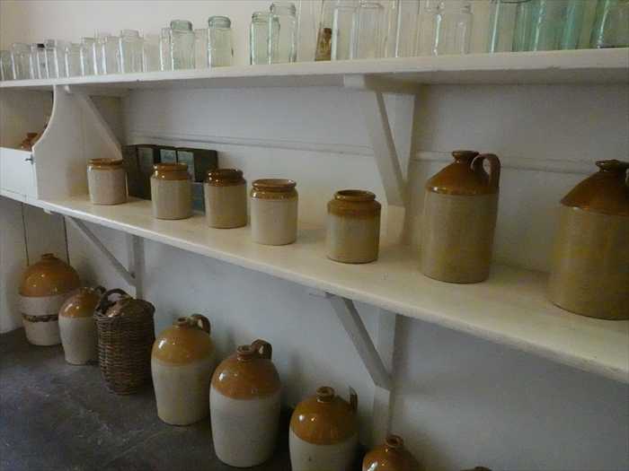 パントリー(食品貯蔵室) の一角には 保存容器類 が並ぶ。