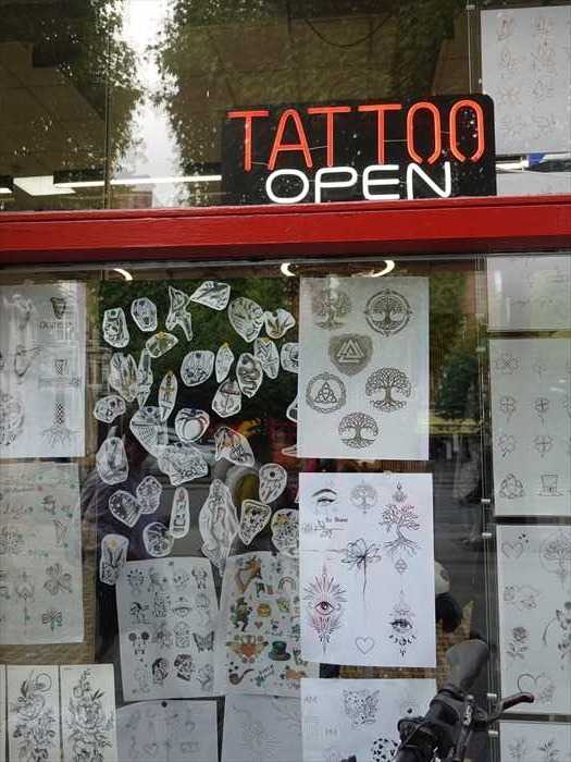 様々なタトゥーのデザイン原画が多数貼られていた。