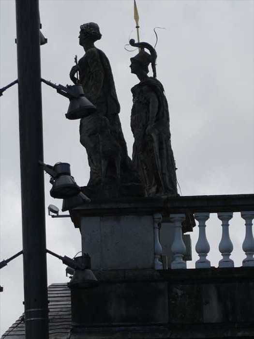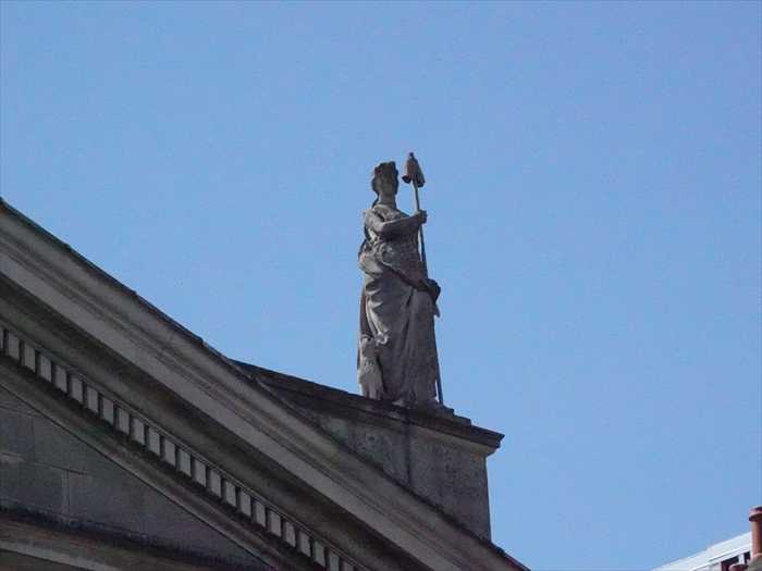 この建物の屋上正面(ペディメントの上)には、3体の古典的彫像が配されていた。
