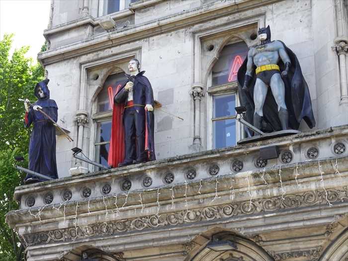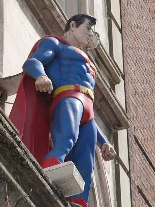 右面のスーパーマン像を含め、同じビルの他の窓にもバットマンやその他のキャラクターの人形が
