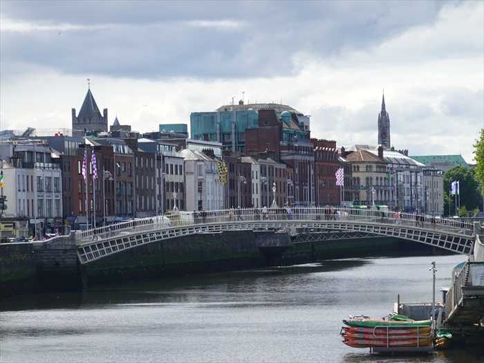 「ハーフペニー橋(Ha'penny Bridge)」 を中心にした リフィー川(River Liffey)沿いの風景