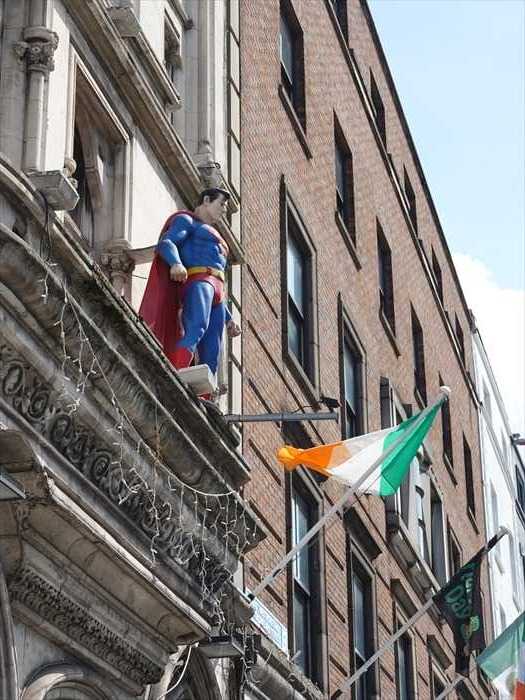 ダブリン中心部にあるビルの上階窓辺に設置された「スーパーマンの立体像」。