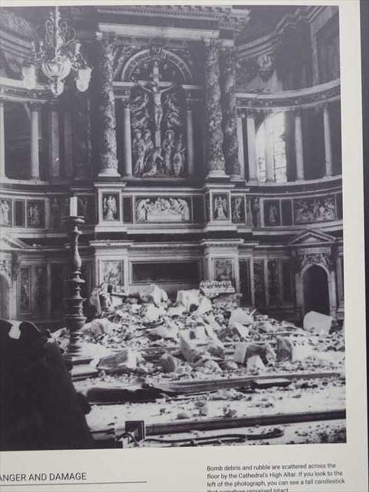 Bomb debris and rubble are scattered across the floor by the Cathedral’s High Altar.