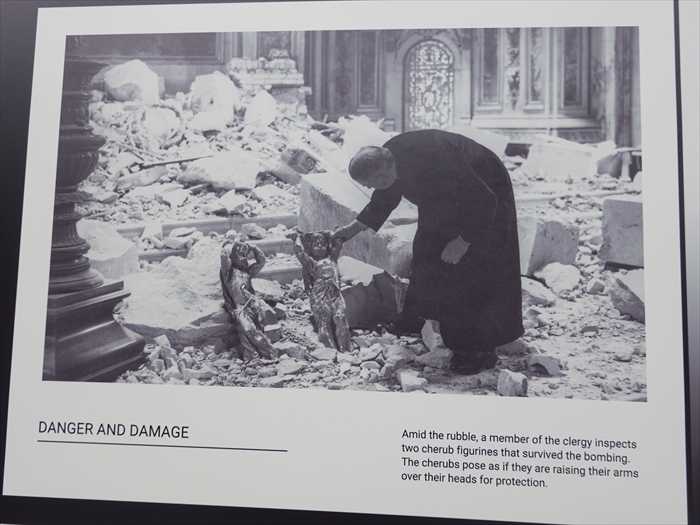 大聖堂の高壇(ハイ・オルター)の床一面に、爆弾による瓦礫や破片が散乱している。