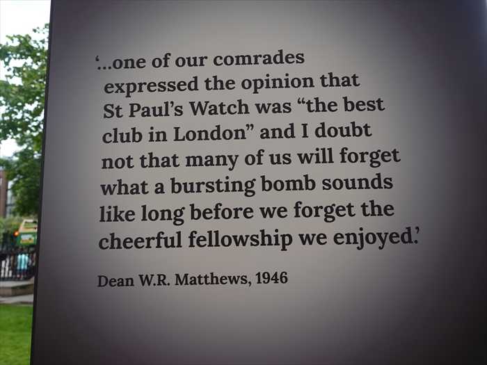 ⑥Dean W.R. Matthews(セント・ポール大聖堂の学長)による1946年の回想 「…one of our comrades expressed the opinion that St Paul’s Watch was ‘the best club in London’ and I doubt not that many of us will forget what a bursting bomb sounds like long before we forget the cheerful fellowship we enjoyed.”