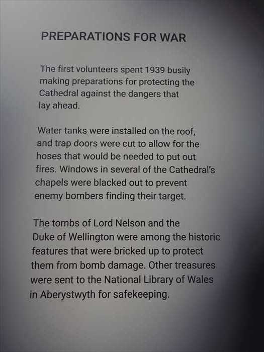 The tombs of Lord Nelson and the Duke of Wellington were among the historic features that were bricked up to protect them from bomb damage. Other treasures were sent to the National Library of Wales in Aberystwyth for safekeeping.」