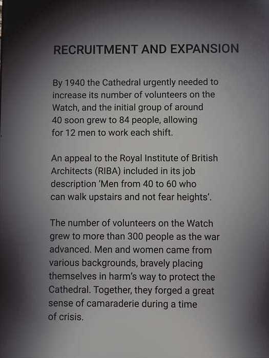 By 1940 the Cathedral urgently needed to increase its number of volunteers on the Watch, and the initial group of around 40 soon grew to 84 people, allowing for 12 men to work each shift.