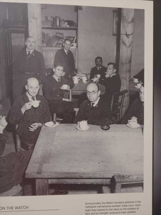 「During breaks, the Watch members gathered in the Cathedral maintenance workers’ mess room. Each night they listened to the news on the wireless for updates of raids and to hear speeches.」