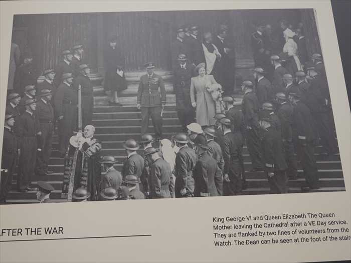 「King George VI and Queen Elizabeth The Queen Mother leaving the Cathedral after a VE Day service. They are flanked by two lines of volunteers from the Watch. The Dean can be seen at the foot of the stair.」