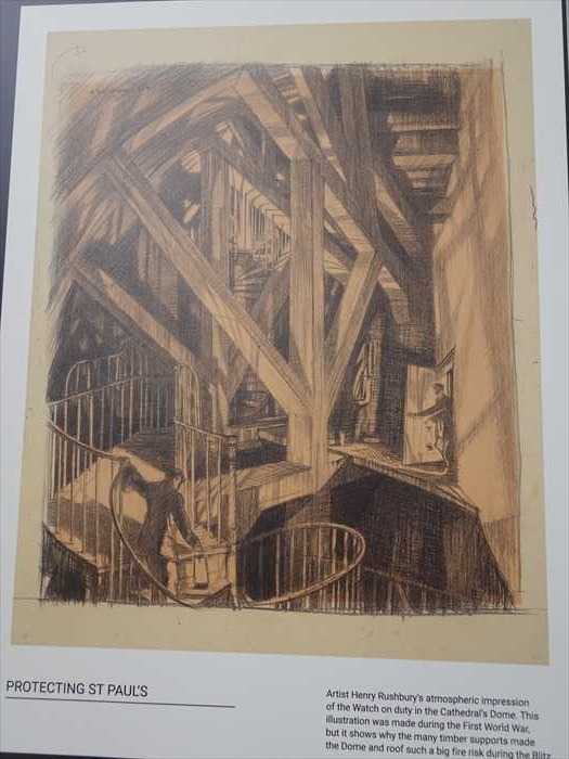 「Artist Henry Rushbury’s atmospheric impression of the Watch on duty in the Cathedral Dome. This illustration was made during the First World War, but it shows why the many timber supports made the Dome and roof such a big fire risk during the Blitz.」