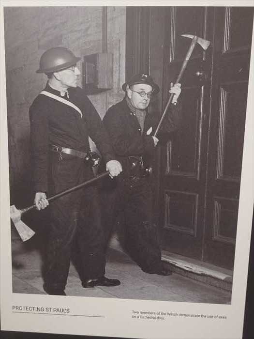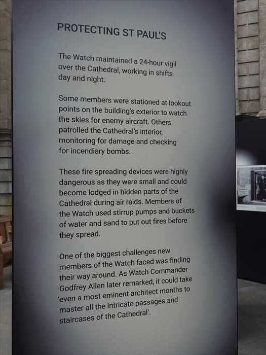 These fire spreading devices were highly dangerous as they were small and could become lodged in hidden parts of the Cathedral during air raids. Members of the Watch used stirrup pumps and buckets of water and sand to put out fires before they spread.