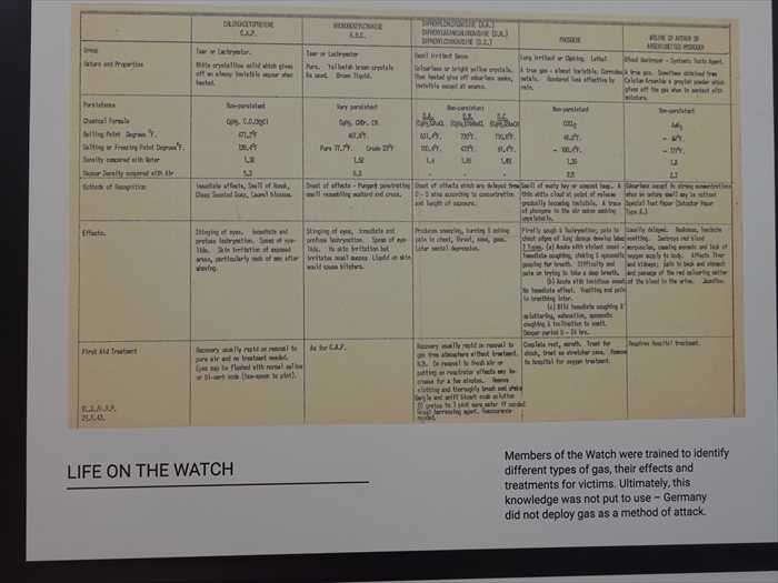 「Members of the Watch were trained to identify different types of gas, their effects and treatments for victims. Ultimately, this knowledge was not put to use – Germany did not deploy gas as a method of attack.」