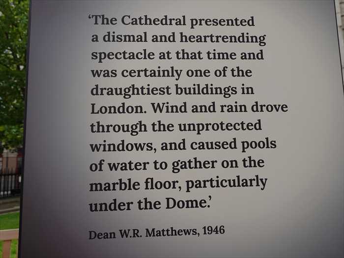 「“The Cathedral presented a dismal and heartrending spectacle at that time and was certainly one of the draughtiest buildings in London. Wind and rain drove through the unprotected windows, and caused pools of water to gather on the marble floor, particularly under the Dome.” — Dean W.R. Matthews, 1946」