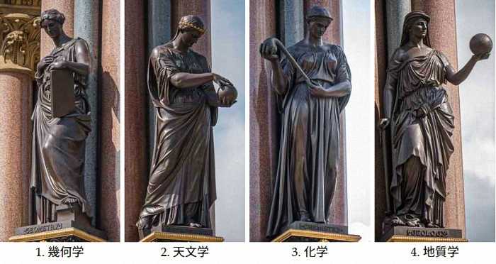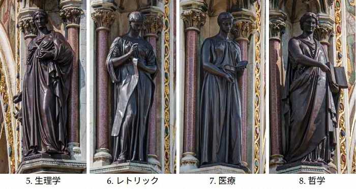 「5. SCIENCESThese eight sculptures, in two tiers, represent the sciences. Four at the bottom symbolise chemistry, astronomy and geology. The top four represent rhetoric, medicine,philosophy and physiology.」