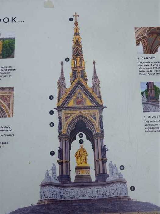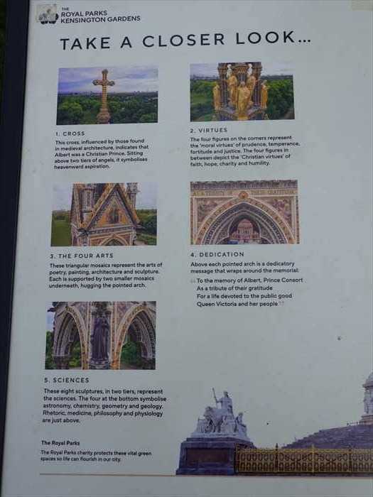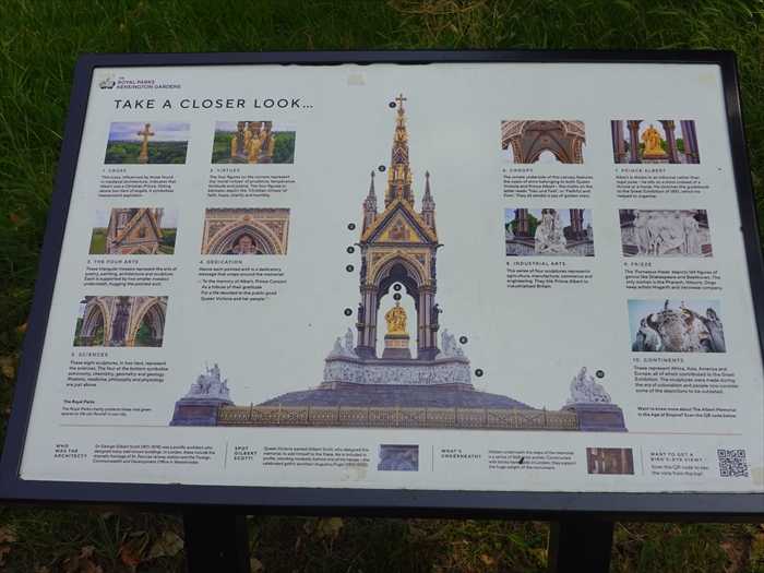 アルバート記念碑(Albert Memorial)前に設置されている解説板。 全体を「Take a closer look…」と題して、モニュメントの構成要素を分かりやすく説明。