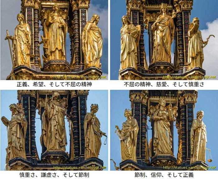 「2. VIRTUES The four figures on the corners represent the moral virtues of prudence, temperance, fortitude and justice. They also embody the Christian virtues of faith,hope, charity and humility.」