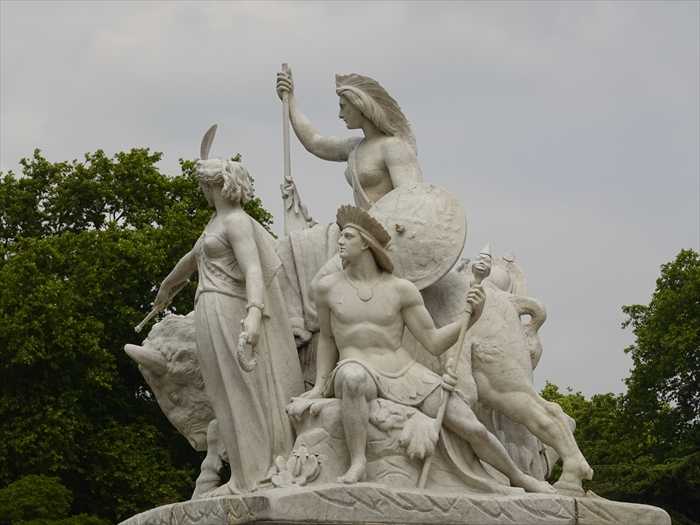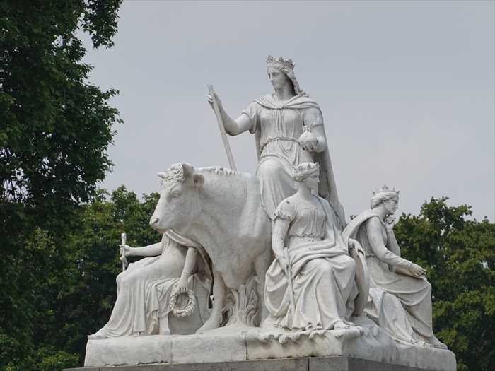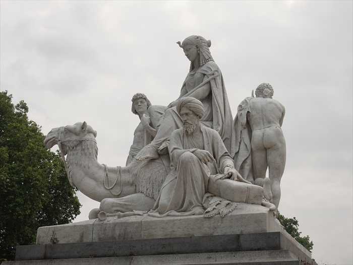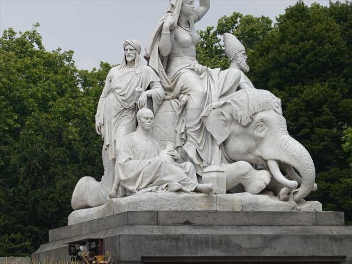 台座四隅の巨大な白い大理石群像(Africa/Asia/Europe/America)。