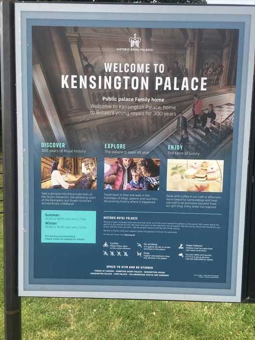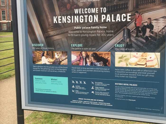 この案内板はケンジントン宮殿(Kensington Palace) のウェルカムボード。 「WELCOME TO
