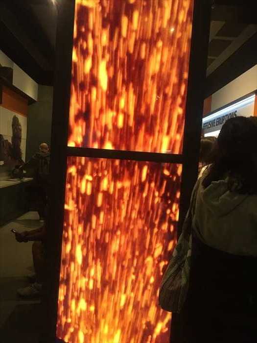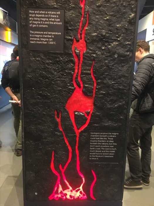 マグマチャンバーと火山噴火の仕組みを解説する展示 (上部パネル) How and when a volcano will erupt depends on if there is any rising magma, what type of magma it is and the amount of gas it contains.The pressure and temperature in a magma chamber are immense. Magma can reach more than 1,000°C.