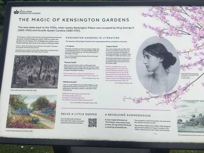 Woolf (1882–1941), one of the foremost modernist writers, drew inspiration from the atmosphere of Kensington Gardens, which features in her essays and novels. She observed how the gardens represented both the continuity of tradition and the fleeting moments of modern life.