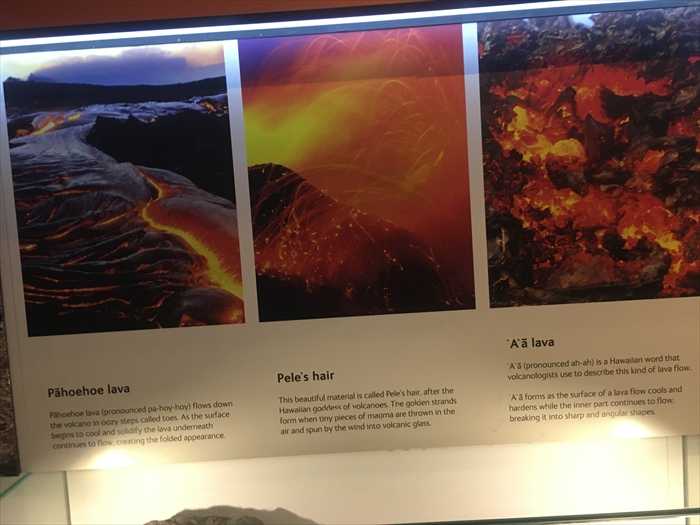 「Volcanoes and Earthquakes(火山と地震)」ギャラリーの解説パネルで、 ハワイ火山に由来する溶岩と噴火産物 を紹介