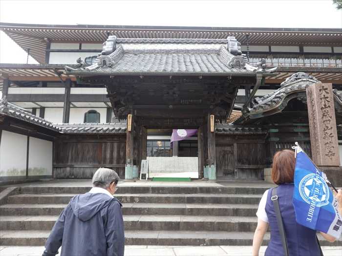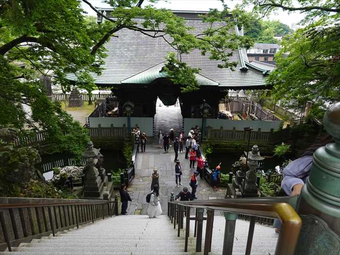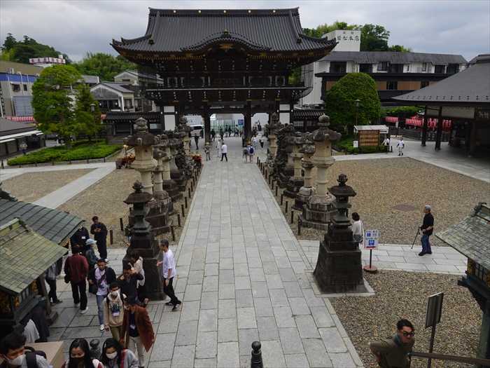 仁王門前から総門を見る。参道の両側には石灯籠が並ぶ。