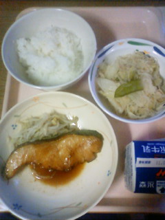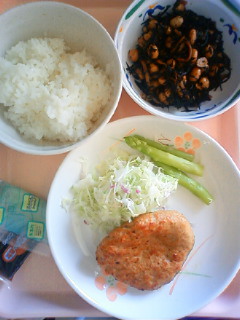 お昼は豆腐ハンバーグとひじき。ひじきは美味しく無かった…ハンバーグは完全に豆腐入ってるって味でした。(^-^;