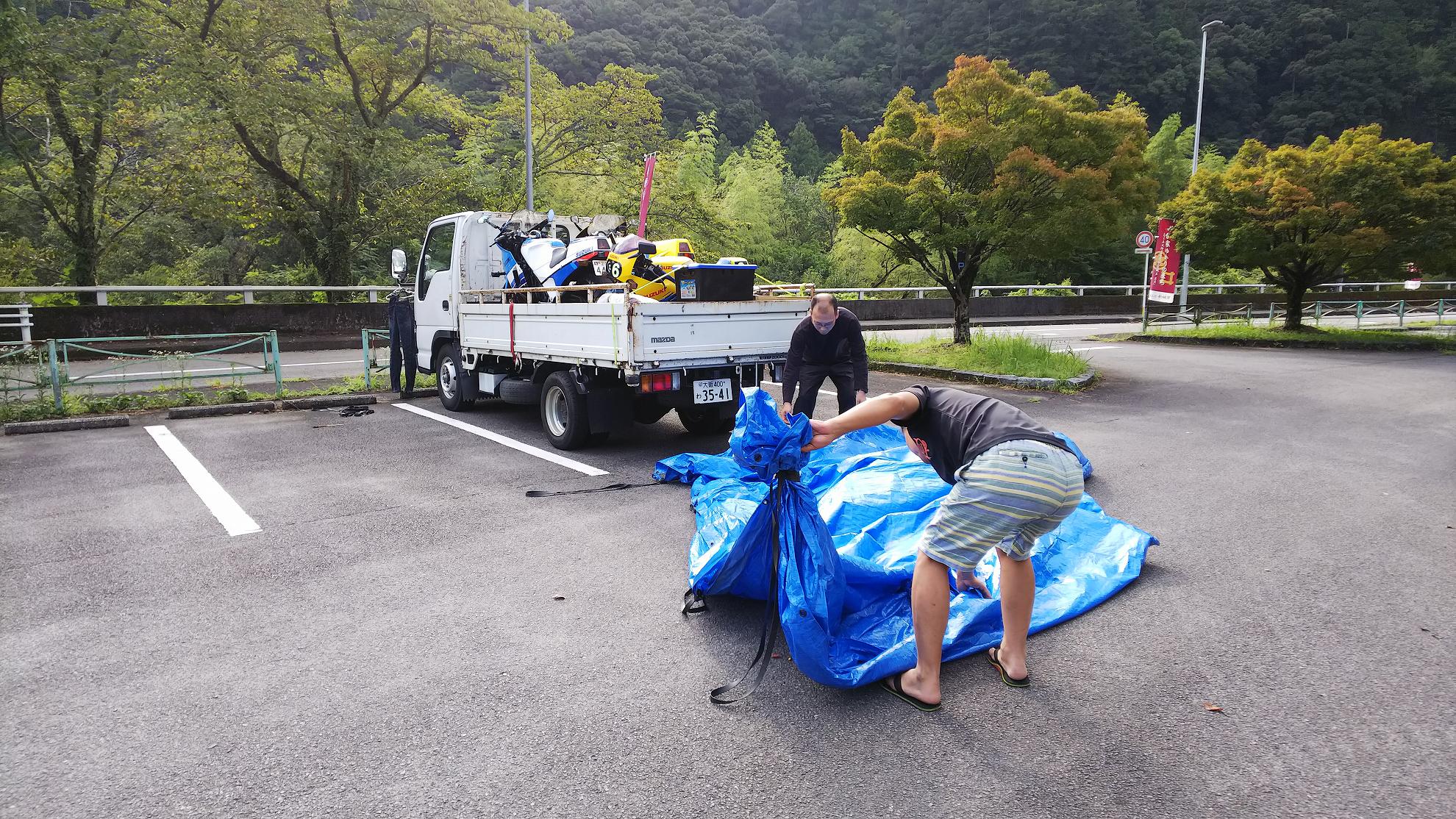 荷物おろして、設営に入ります。。。昨日のゲリラ豪雨で、ブルーシート買われたそうで。。。