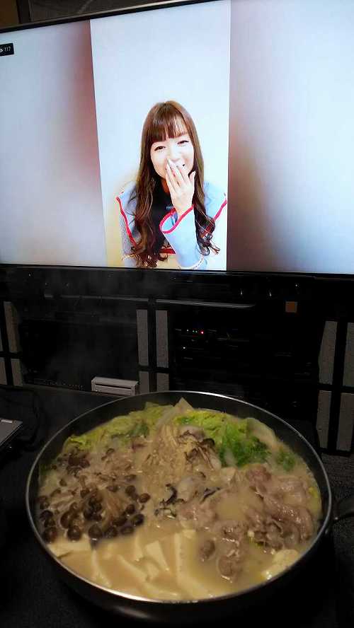 残業して、帰ってきたら、ちぱるちゃんの配信やってたので、聞きながら、ごま豆乳鍋作っていただいてます。