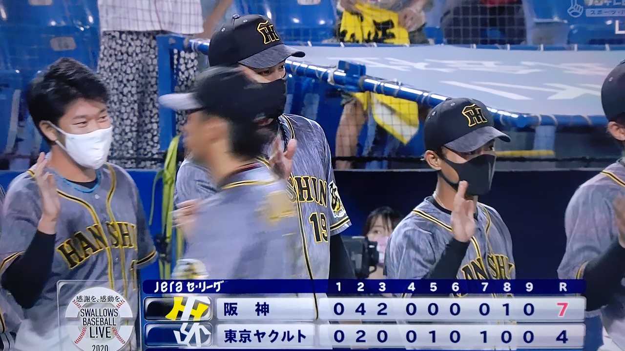 その裏ヤクルトは先頭エスコバーの内野安打。捕手・梅野の二塁悪送球と田代・犠打で一死2・3塁とする。8番 西田は空振り三振に倒れるが、梅野・捕逸で振り逃げとなって1点。尚も1・3塁から吉田のスクイズ(野選)で2点目が入る。藤浪は次の坂口に四球を与えて一死満塁と絶体絶命だったが、宮本・左飛。青木も右飛に打ち取り、何とか踏ん張った。