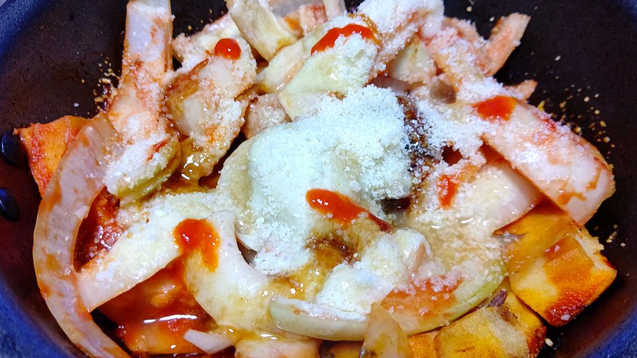 高野豆腐と玉ねぎを、オリーブオイルで炒めて、ニンニクチューブ、トマトジュース、ケチャップ、とろけるチーズ、粉チーズ、ハラペーニョ