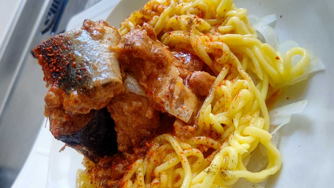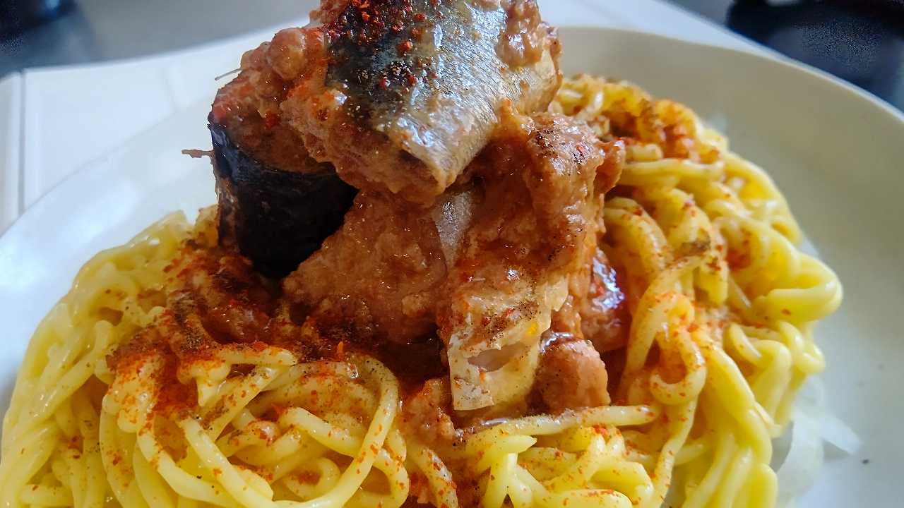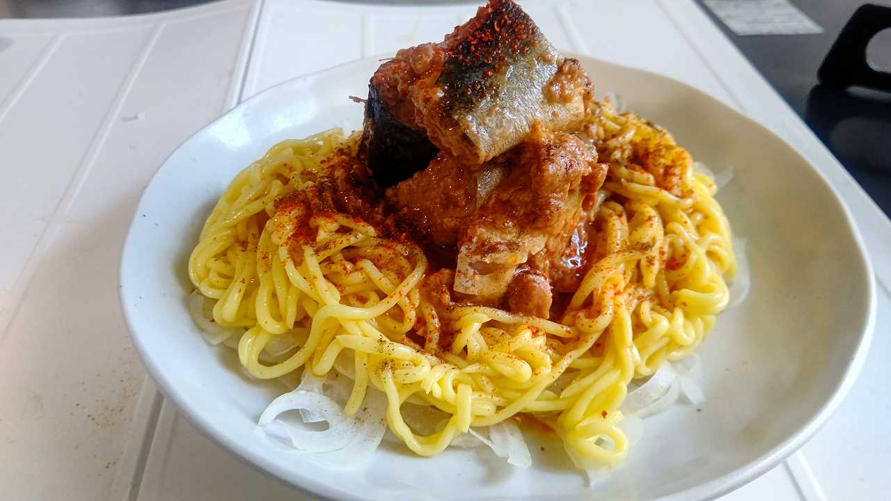 玉ねぎスライスして、コンニャク冷麺ゴマダレに、鯖味噌缶