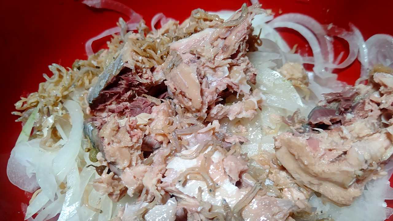 淡路島新玉ねぎスライスに、塩分無使用鯖缶水煮