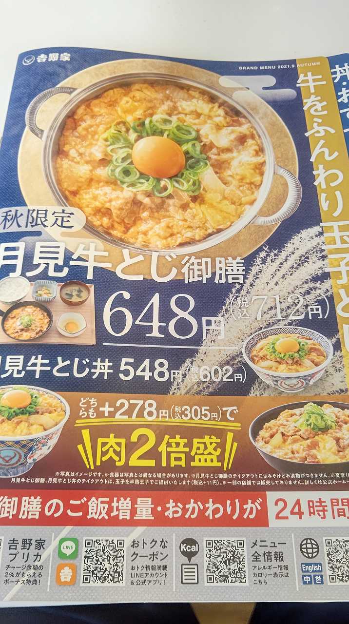 頭痛やら吐き気やら、体調は良くないですが、足の痛みは良くなって来たので、リハビリに、近所の吉野家まで