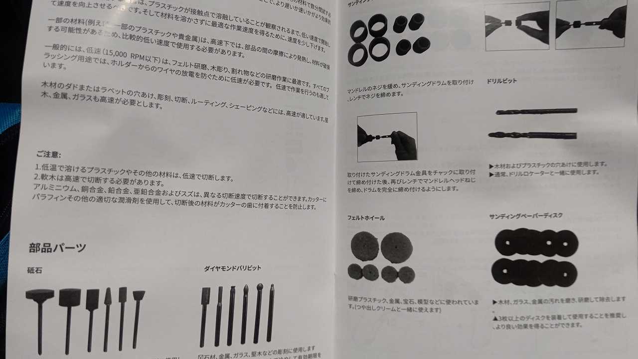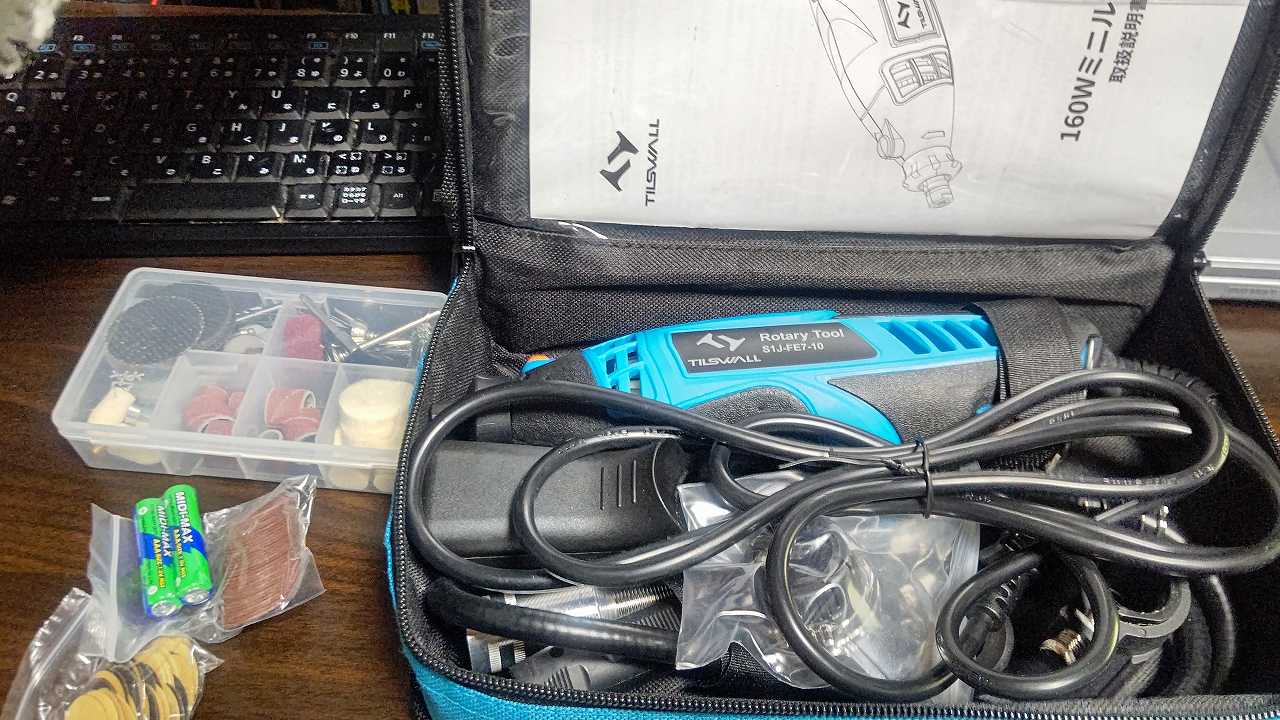 ミニルーター、専用収納バッグ、フレックスシャフト、アクセサリー用収納ケース、彫刻カッター、サンディングペーパー、サンディングバンド、カットホイール、ダイヤモンド研削針、研削砥石、フェルトホイール、ドリルビット、ステンレスブラシ、切断ガイド、保護カバー、補助ハンドル、レンチ。