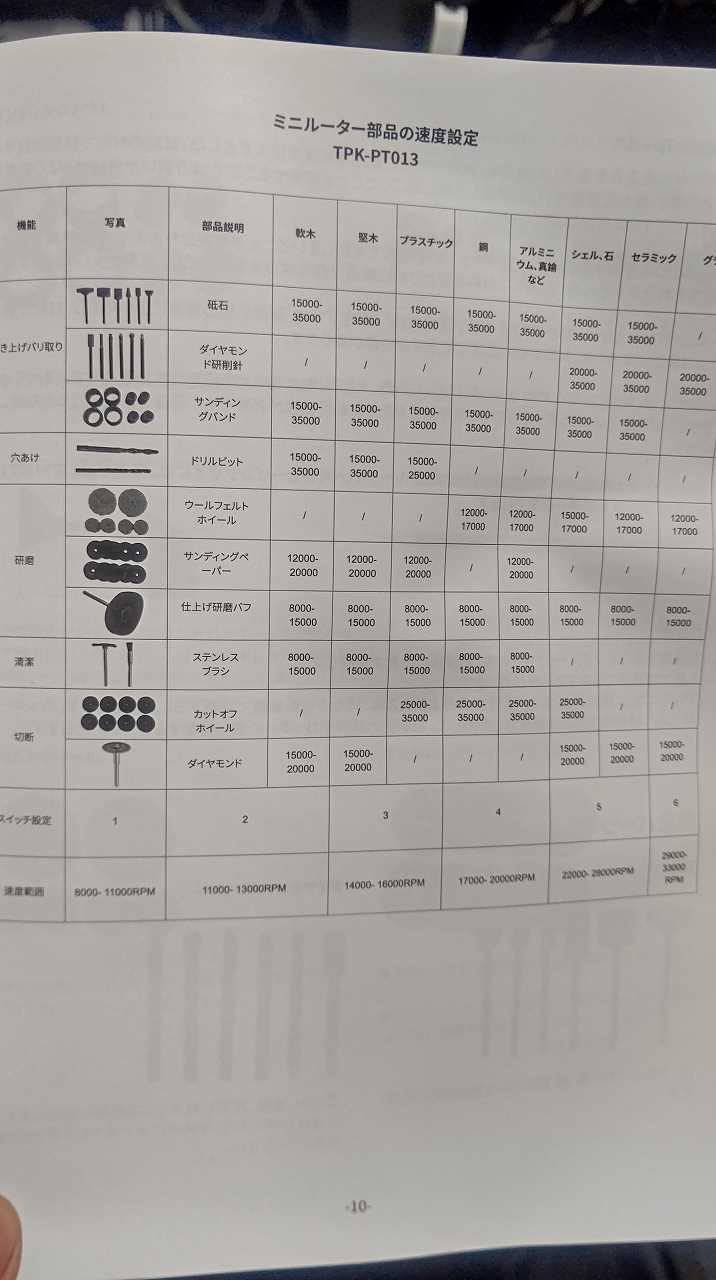 6段階の変速ができ、最小は8000rpm、最大は33000rpmに達せられるので、作業内容や材料に合わせて調節でき、最適な回転数で彫刻/穴あけ/研磨/切断/切削/汚れ落としなど、様々な作業を楽々にします。