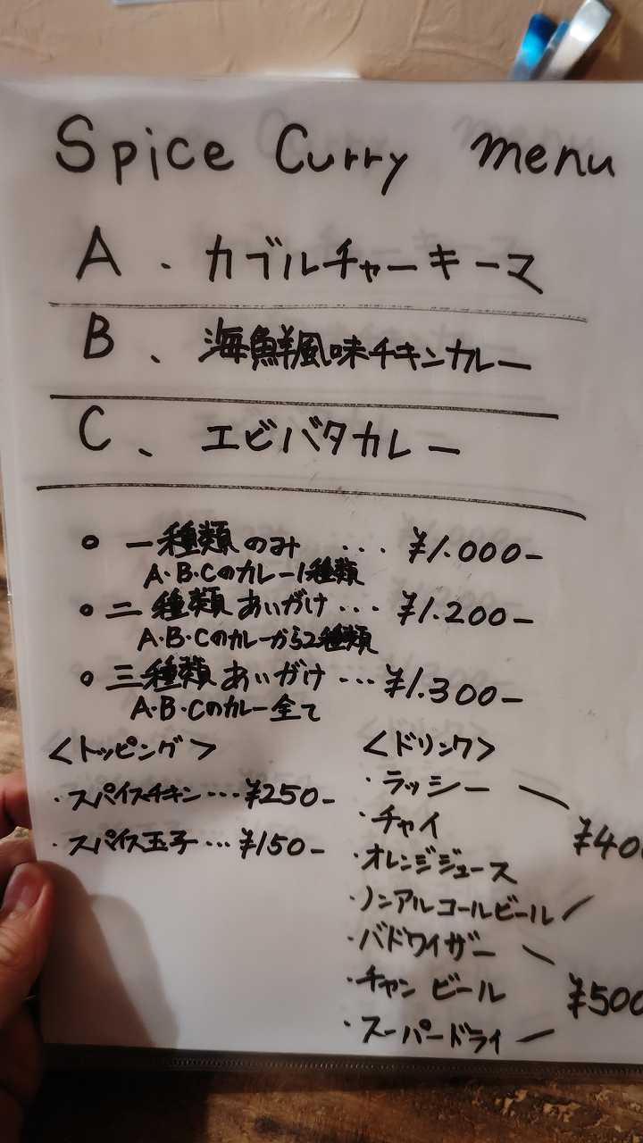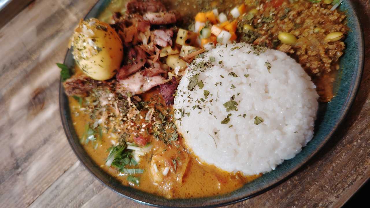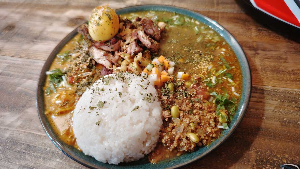 三種類あいがけ 1300円、スパイスチキン250円、スパイス玉子150円でいただきました。