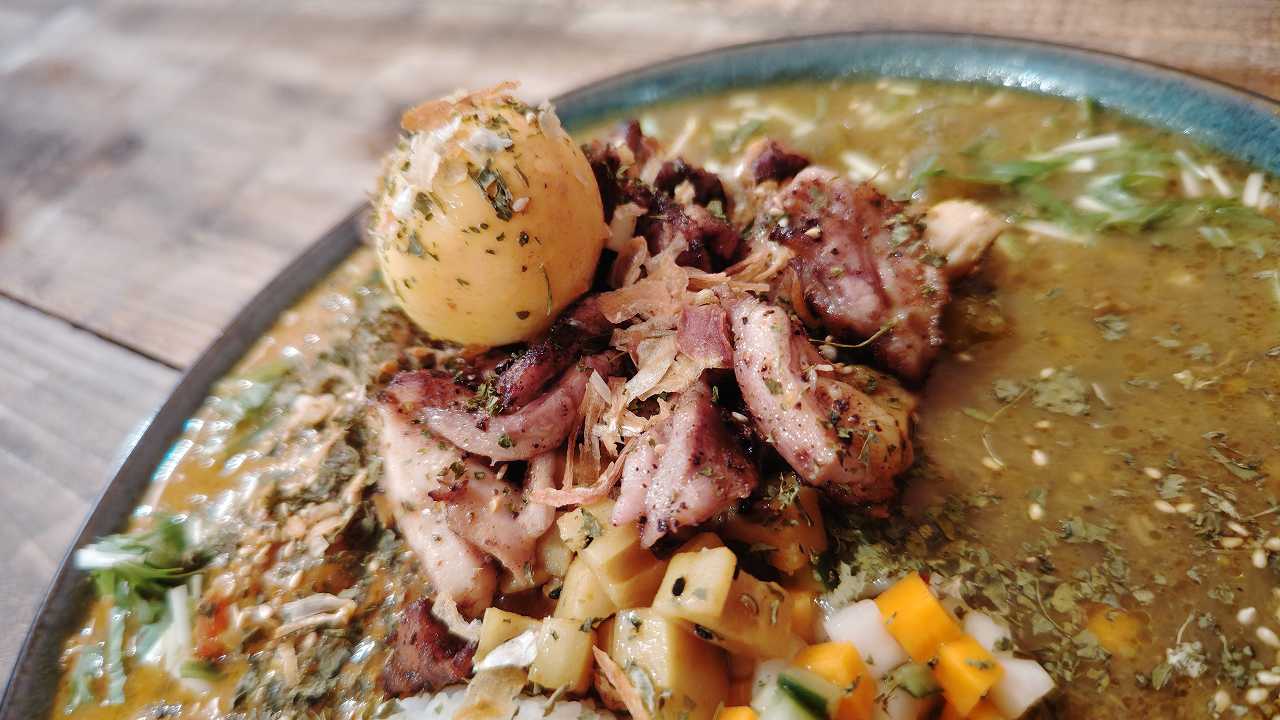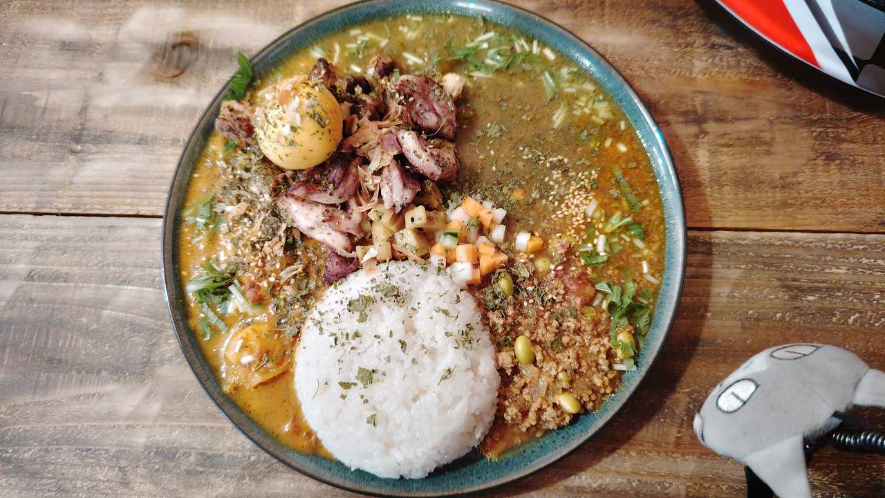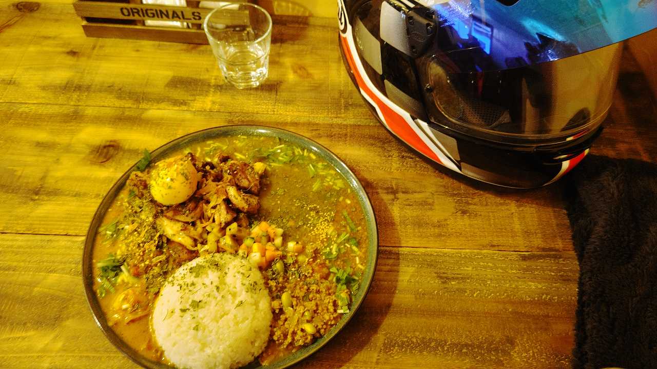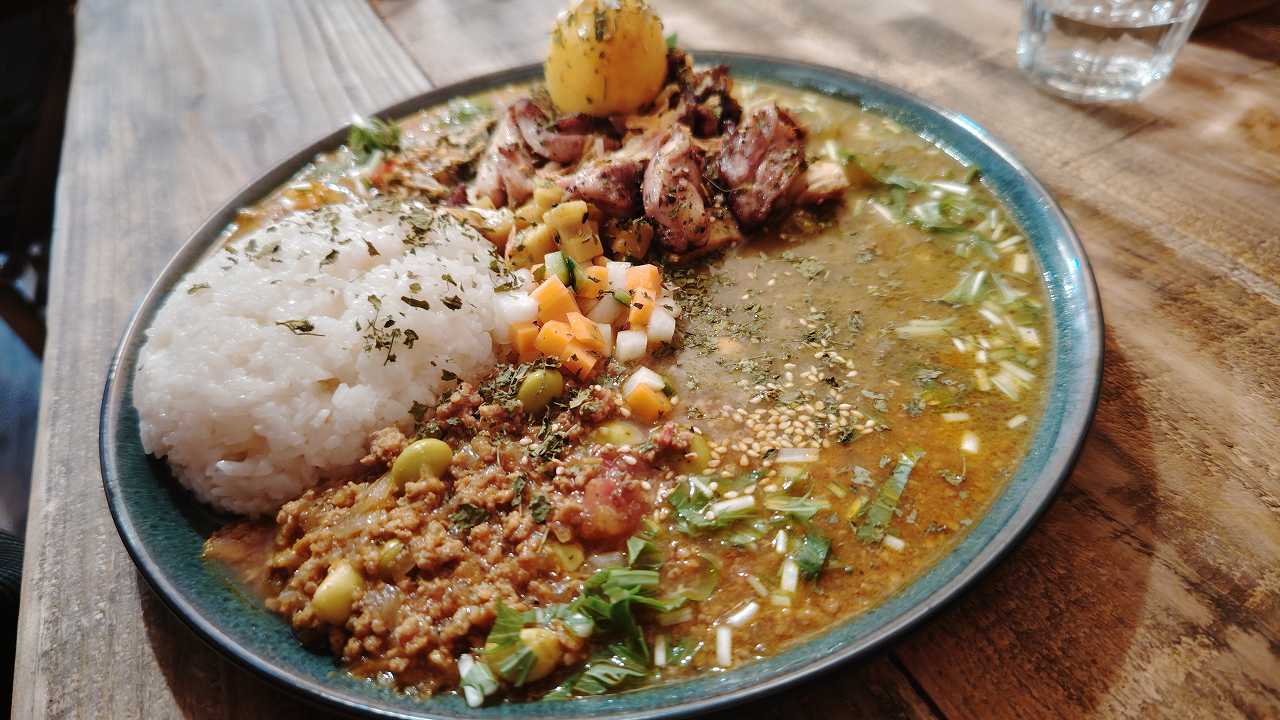三種類あいがけ 1300円、スパイスチキン250円、スパイス玉子150円でいただきました。