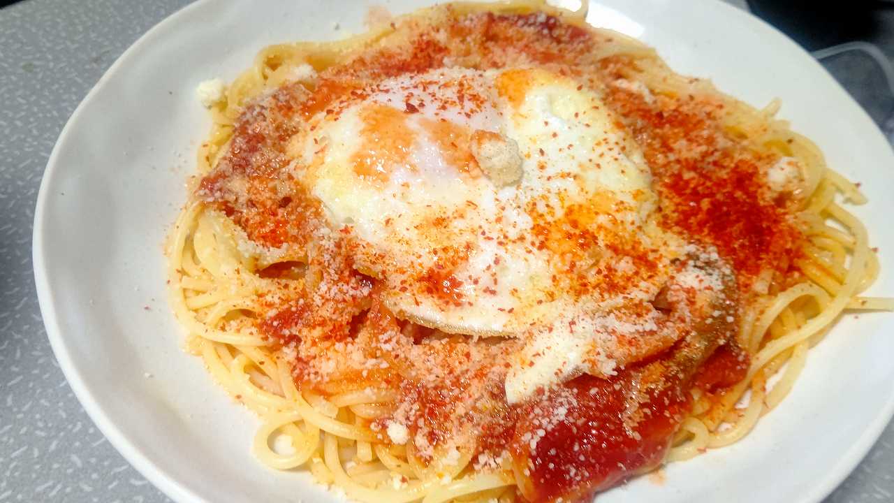ナポリタンには、目玉焼きに、粉チーズとタバスコと熱辛唐辛子たっぷり。。。これもなかなか
