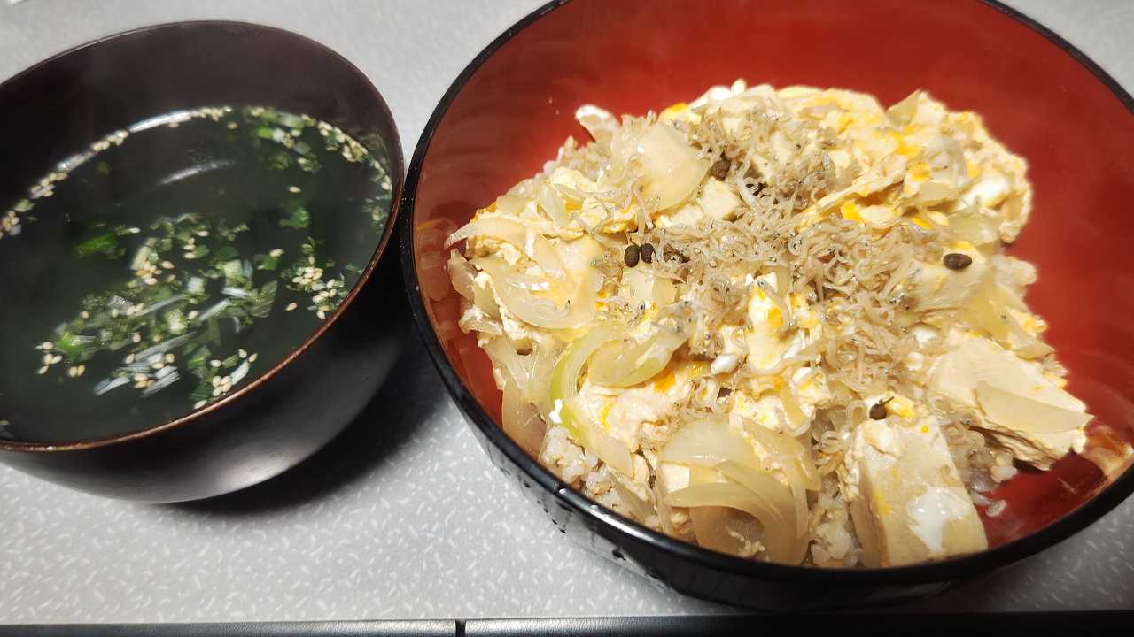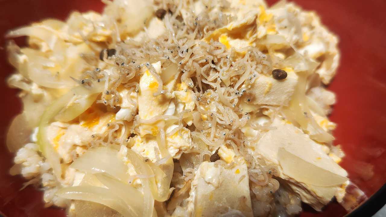 玄米に、高野豆腐丼。ちりめん山椒トッピング
