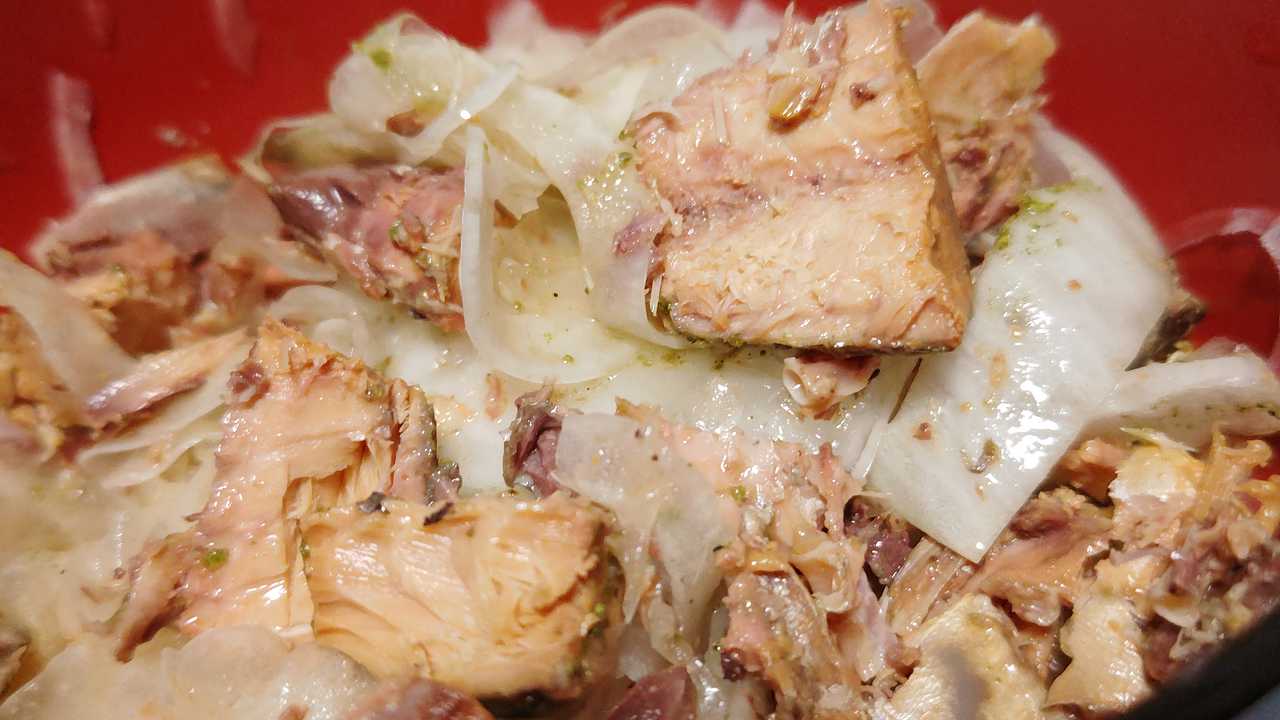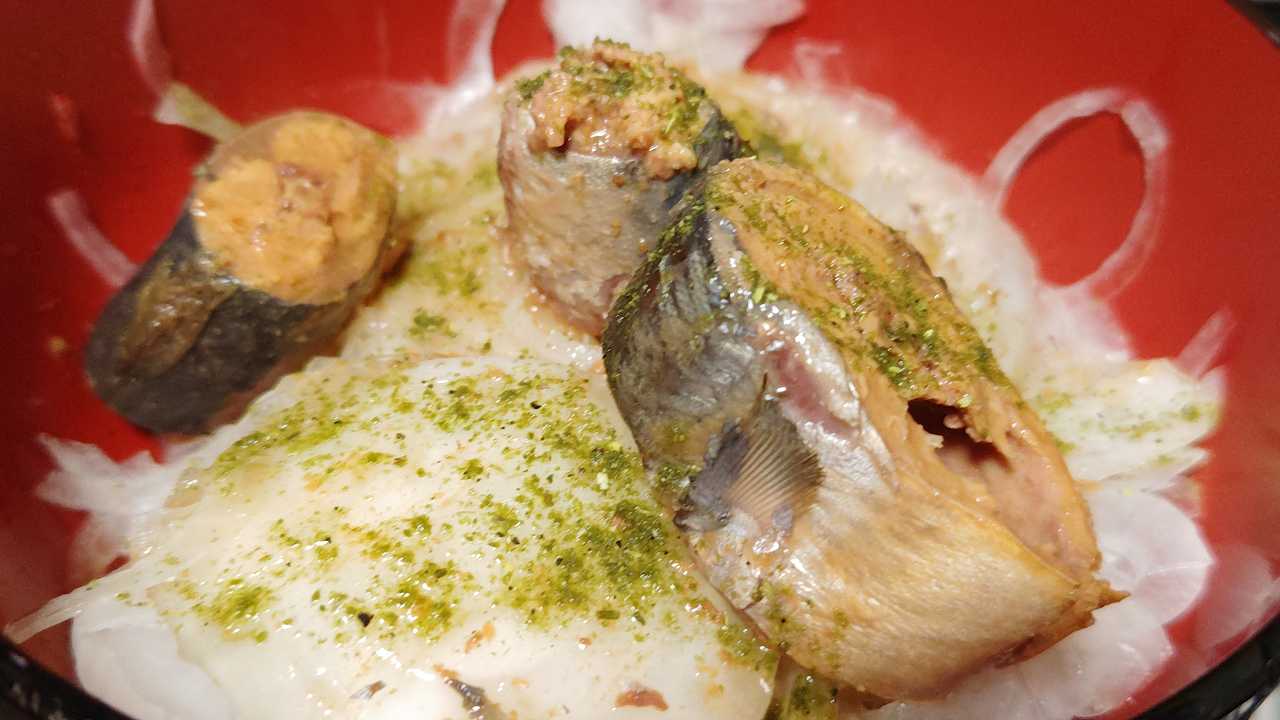 新玉ねぎ特大1個スライスに、鯖缶醤油味。山椒たっぷりで