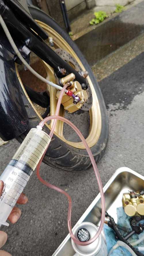 注射器の中には、まだ、フルード残ってるので、それをマスターのほうに入れながら、握って、ニップル開けて閉めて、レバー放して、握っての繰り返し