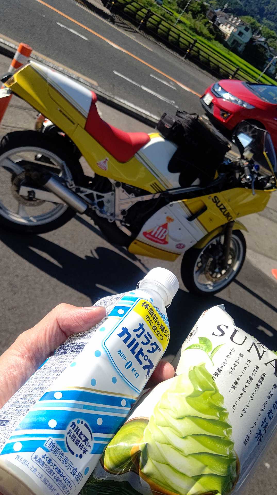 ってことで、満タン入れて、向かいの自動販売機で、水分補給。。。