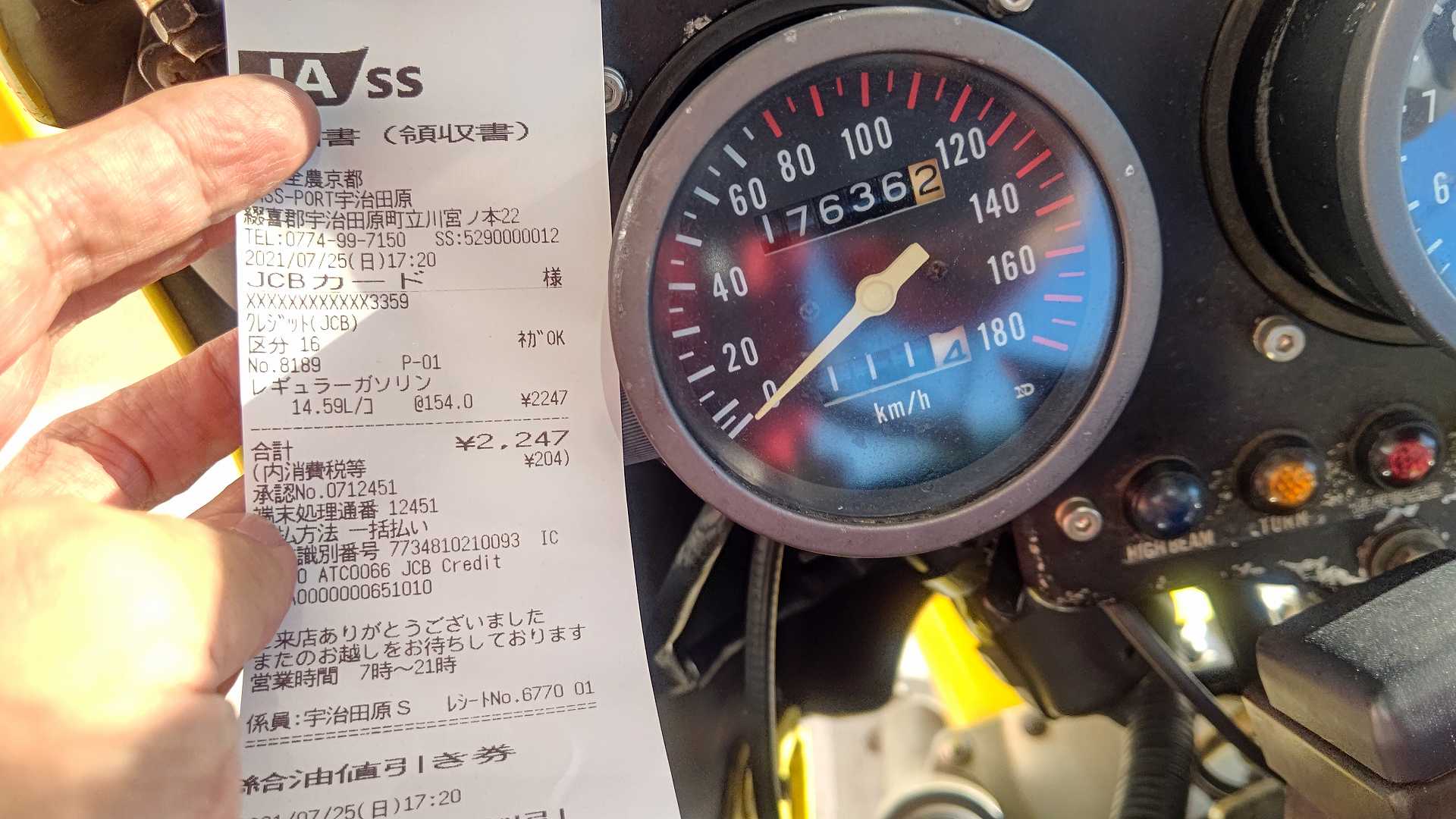油断すると、バイクごと倒れてしまいそうになりながら、ガソリン入れてもらって。。。