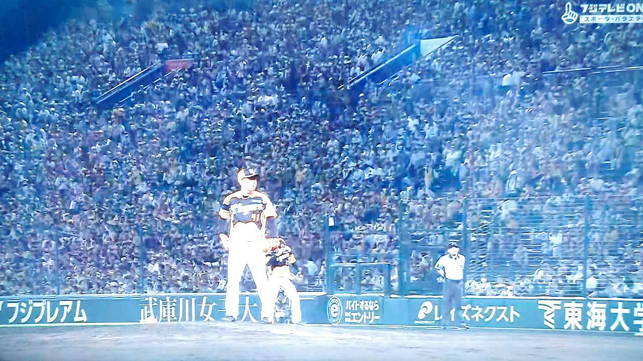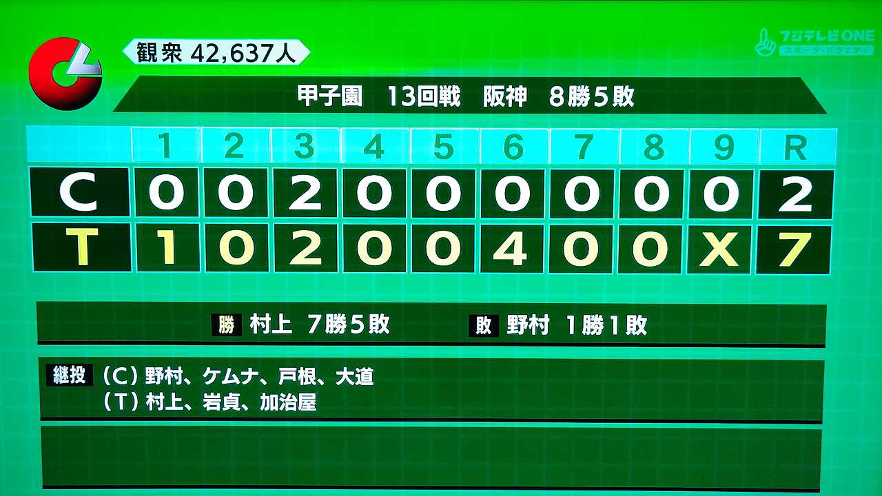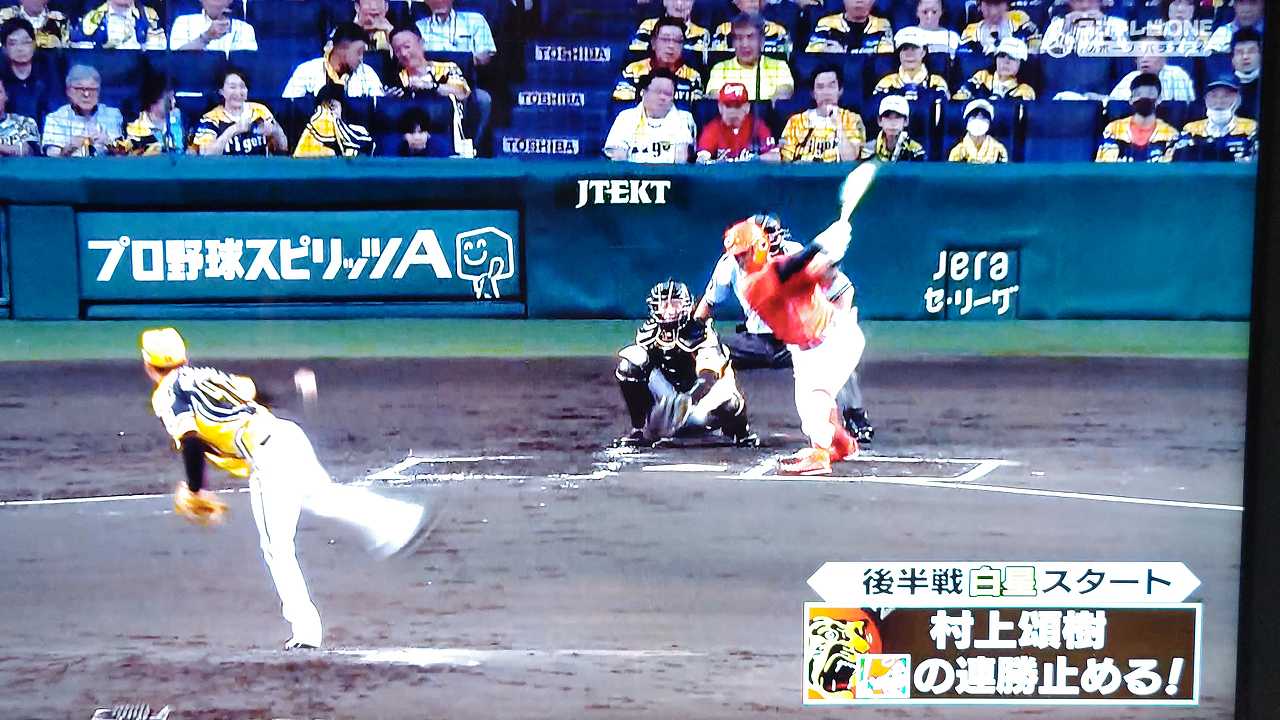 村上は2回も3人でピシャリと抑えたが3回に2点を失い逆転されてしまう。だがリードを許す時間は実に少なかった。その裏に1死1、2塁のチャンスを作ると森下の安打に相手の失策が重なり2者が生還、すぐさま試合をひっくり返した。